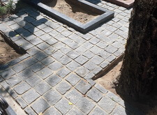 Перед тем, как закладывать участок брусчаткой, мы застелили территорию места захоронения геотекстилем, препятствующим дальнейшему прорастанию травы в швах между плитками.
