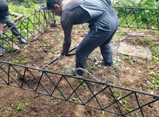Далее мы перешли к следующему подготовительному этапу, который необходимо осуществить перед укладкой наземного покрытия: создание надёжного периметра из металлических полос. Его приварили с углам ограждения, опять-таки сверившись с уровнем.